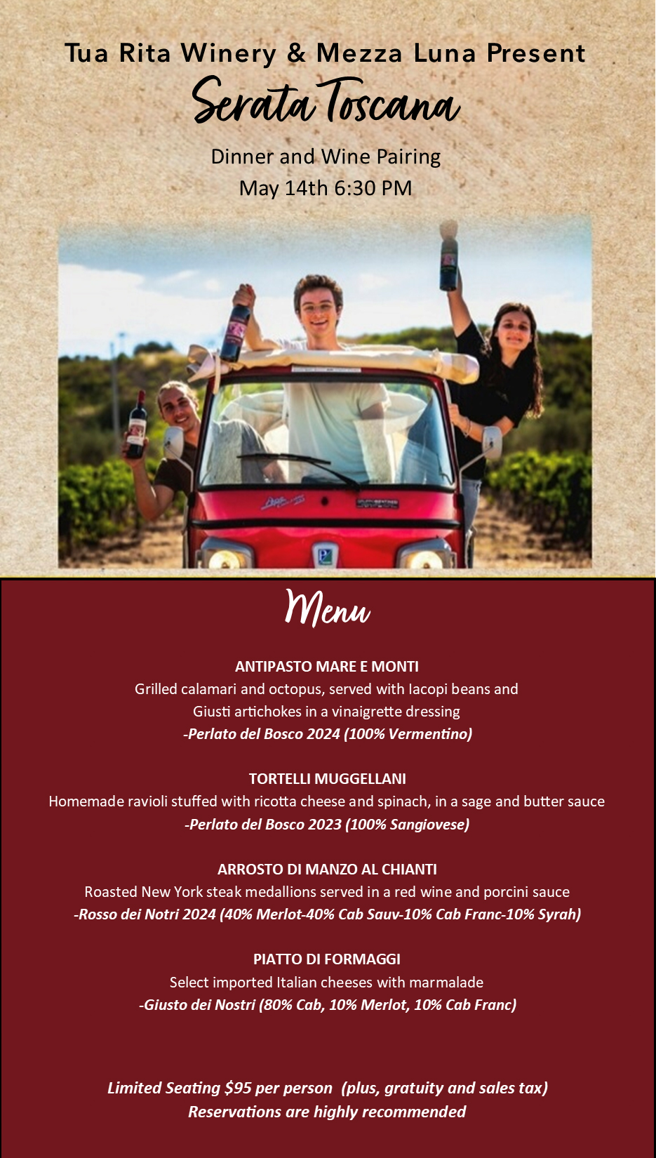 Enjoy a Tuscan-themed fixed-price menu paired with varietals from Tua Rita Winery. Call (650) 728-8108 for reservations. Seating is limited.